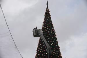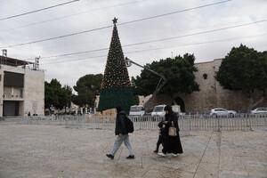 Palestinesi preparano un albero di Natale in Manager Square nella città di Betlemme in Cisgiordania