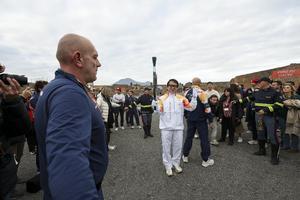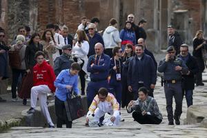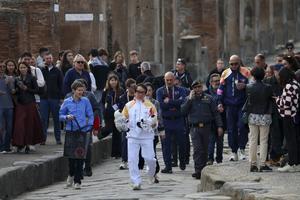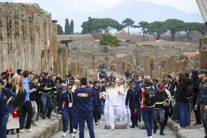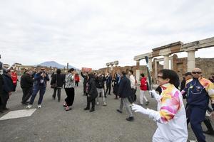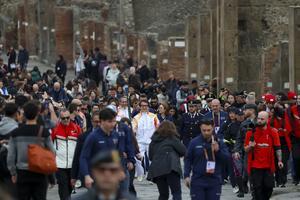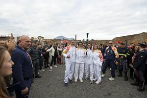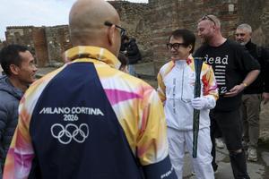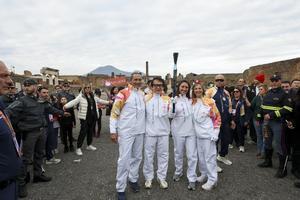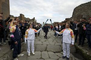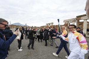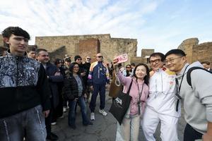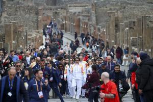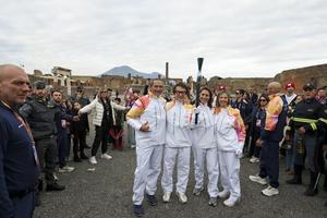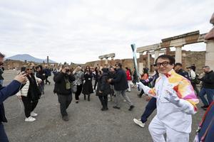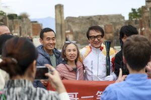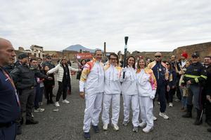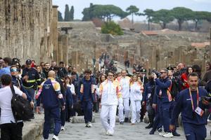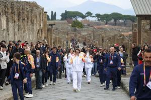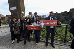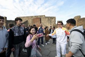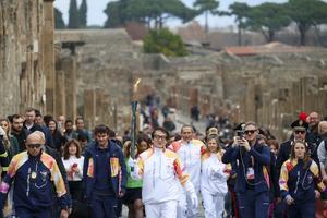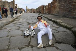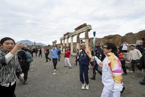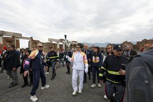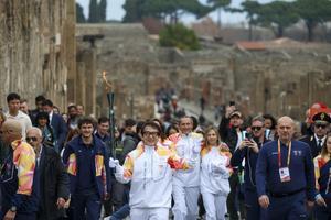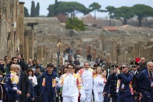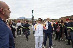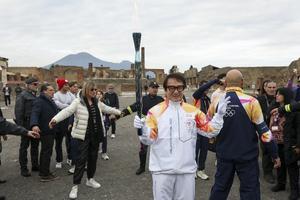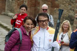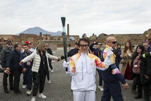 La fiaccola olimpica arrivata negli Scavi di Pompei accolta da Jackie Chan.