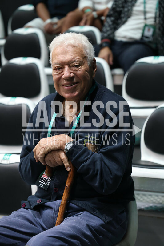 Former italian tennis legend and Davis Cup winner Nicola Pietrangeli (age 91) during the tennis Davis Cup final 8 match between Joao Fonseca (Brazil) and Botic Van De Zandschulp (Netherlands) at the Unipol arena, Casalecchio (Bologna), Bologna, northern Italy, Thursday, September 12, 2024. Sport - Tennis - (Photo Michele Nucci - LaPresse)