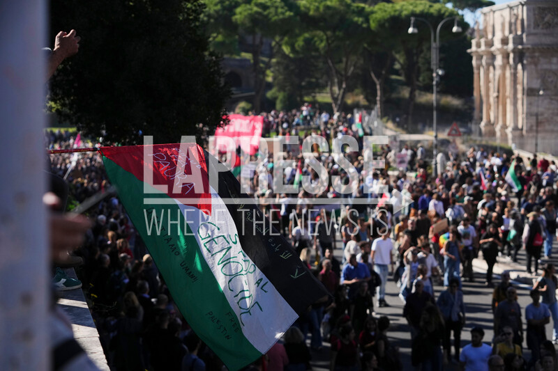 Pro-Palestinian demonstrators march during a national demonstration in support of the population of Gaza, in Rome, Saturday, Oct. 4, 2025. (AP Photo/Alessandra Tarantino)