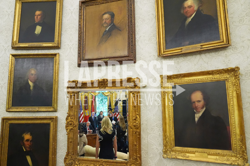 Il presidente Donald Trump firma un nuovo ordine esecutivo nello Studio Ovale della Casa Bianca