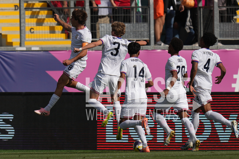 United States' Benjamin Cremaschi, left, celebrates scoring his side's opening goal against Italy during a FIFA U-20 World Cup round of sixteen soccer match at El Teniente Stadium in Rancagua, Chile, Thursday, Oct. 9, 2025. (AP Photo/Andre Penner)