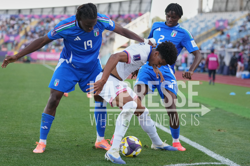 United States' Joshua Wynder, center, Italy's Alvin Okoro, left, and Italy's Javison Idele battle for the ball during a FIFA U-20 World Cup round of sixteen soccer match at El Teniente Stadium in Rancagua, Chile, Thursday, Oct. 9, 2025. (AP Photo/Andre Penner)