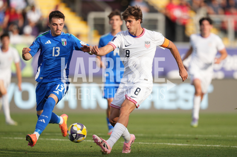 United States' Benjamin Cremaschi, right, scores his side's 3rd goal against Italy during a FIFA U-20 World Cup round of sixteen soccer match at El Teniente Stadium in Rancagua, Chile, Thursday, Oct. 9, 2025. (AP Photo/Andre Penner)