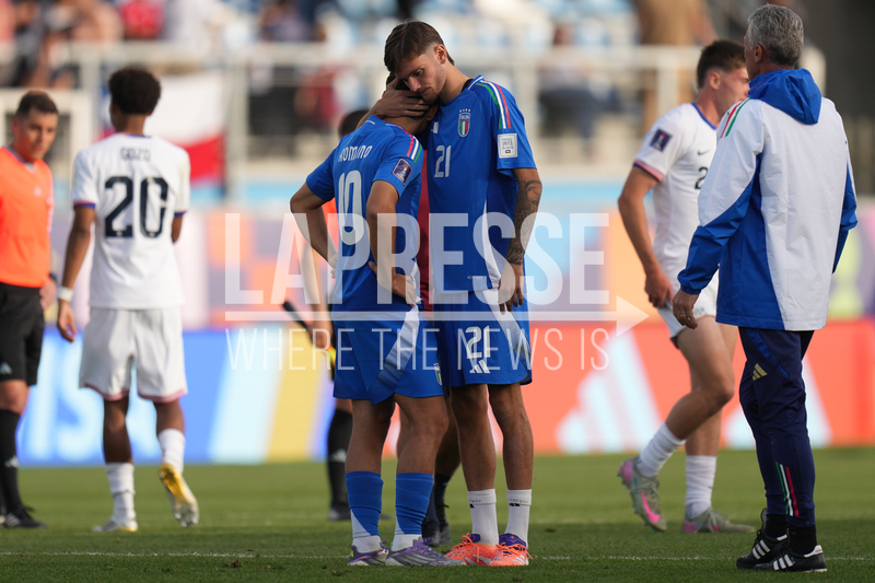 Players of Italy react after losing a FIFA U-20 World Cup round of sixteen soccer match against United States at El Teniente Stadium in Rancagua, Chile, Thursday, Oct. 9, 2025. (AP Photo/Andre Penner)