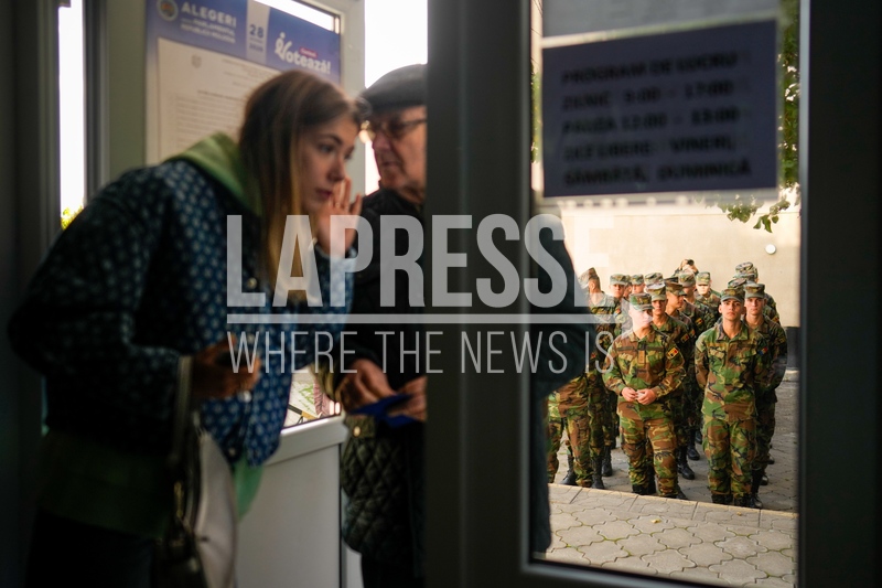 FILE - Soldiers wait outside a voting stations to cast their vote during a parliamentary election, in Chisinau, Moldova, Sunday, Sept. 28, 2025. (AP Photo/Vadim Ghirda)