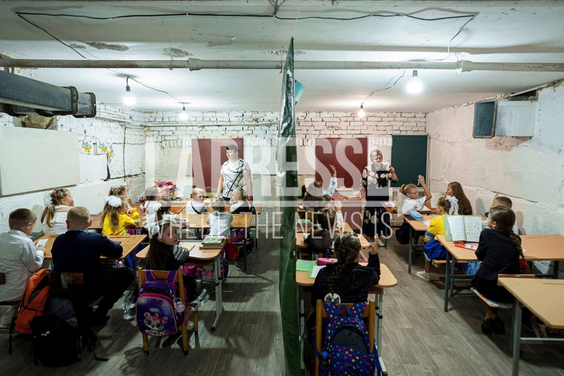 FILE - School students listen to their teachers during a lesson in the basement of a municipal building on the first day of school in Bobryk, Sumy region, Ukraine, Monday, Sept. 1, 2025. The Bobryk school was forced to move to the basement due to endless alarms. (AP Photo/Evgeniy Maloletka)