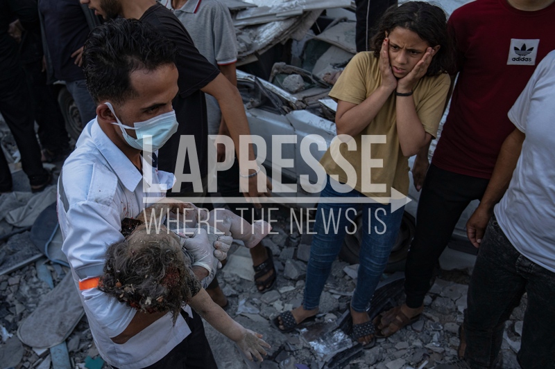 FILE.- A Palestinian girl reacts as a child's body is carried from the rubble of a building after an airstrike in Khan Younis, Gaza Strip, on Oct. 21, 2023. (AP Photo/Fatima Shbair,File)