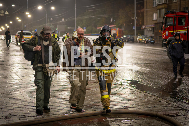 A rescuer helps an injured man after a Russian strike on a residential building in Kyiv, Ukraine, Friday, Oct. 10, 2025. (AP Photo/Dan Bashakov)