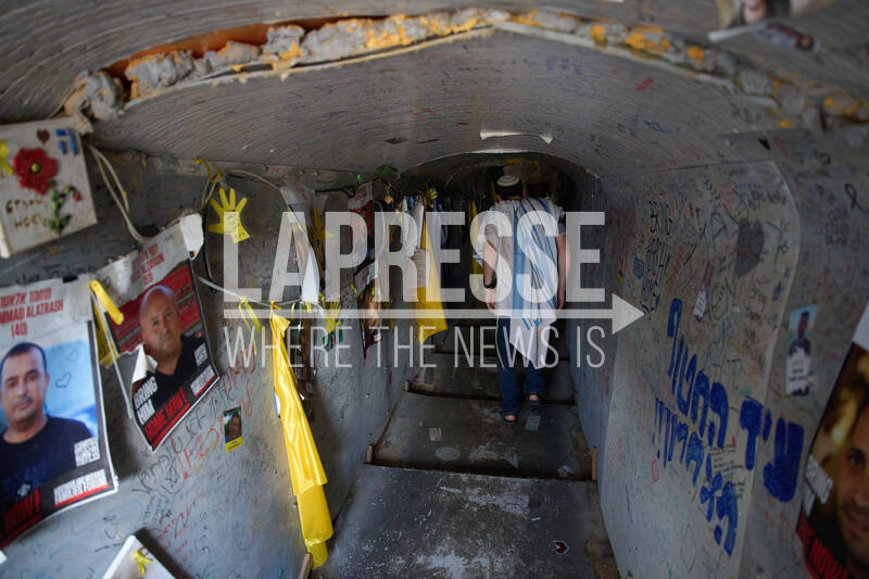 Covered in a prayer shawl, a man visits an installation simulating a tunnel in Gaza in an act of solidarity with hostages believed to be held underground by Hamas during the Jewish holiday of Sukkot, at a plaza known as hostages square, in Tel Aviv, Israel, Friday, Oct. 10, 2025. (AP Photo/Ariel Schalit)