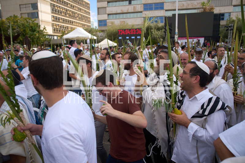 Covered in prayer shawls, men dance and hold the four items used as a symbol on the Jewish holiday of Sukkot, at a plaza known as hostages square following the announcement that Israel and Hamas have agreed to the first phase of a peace plan to pause the fighting in Gaza, in Tel Aviv, Israel, Friday, Oct. 10, 2025. (AP Photo/Ariel Schalit)