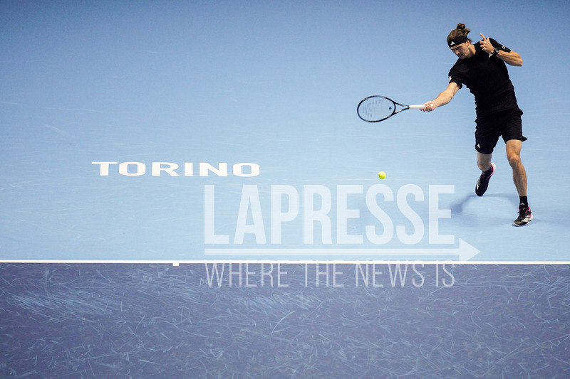 Germany's Alexander Zverev returns the ball to Italy's Jannik Sinnerduring the singles tennis match of the ATP World Tour Finals at the Inalpi Arena in Turin, Italy - Wednesday, Nov. 12, 2025. Sport - (Photo by Marco Alpozzi/Lapresse)