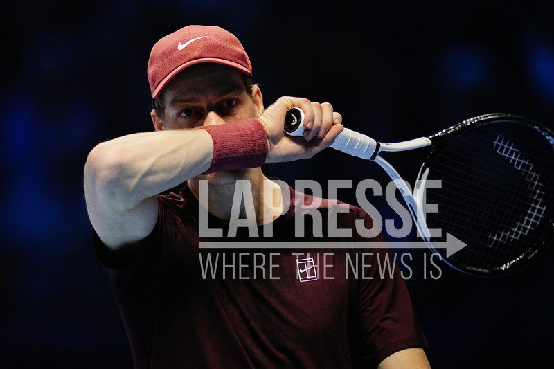 Italy's Jannik Sinner react during the singles tennis match of the ATP World Tour Finals against Germany's Alexander Zverev at the Inalpi Arena in Turin, Italy - Wednesday, Nov. 12, 2025. Sport - (Photo by Marco Alpozzi/Lapresse)