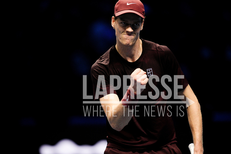 Italy's Jannik Sinner react during the singles tennis match of the ATP World Tour Finals against Italy's Jannik Sinner at the Inalpi Arena in Turin, Italy - Wednesday, Nov. 12, 2025. Sport - (Photo by Marco Alpozzi/Lapresse)