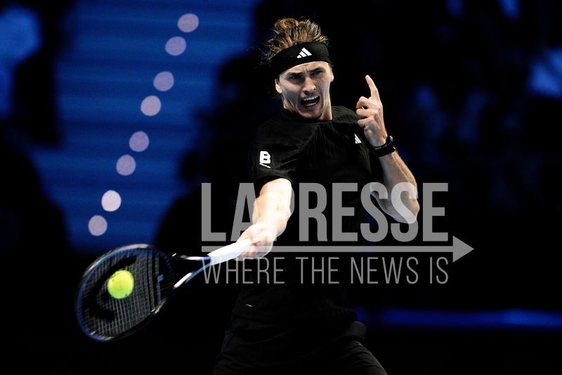 Germany's Alexander Zverev returns the ball to Italy's Jannik Sinner during the singles tennis match of the ATP World Tour Finals at the Inalpi Arena in Turin, Italy - Wednesday, Nov. 12, 2025. Sport - (Photo by Marco Alpozzi/Lapresse)