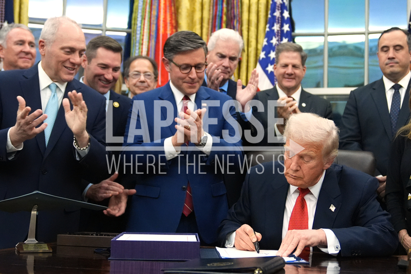 As Rep. Steve Scalise, R-La., left, and House Speaker Mike Johnson of La., applaud, President Donald Trump signs the funding bill to reopen the government, in the Oval Office of the White House, Wednesday, Nov. 12, 2025, in Washington. (AP Photo/Jacquelyn Martin)