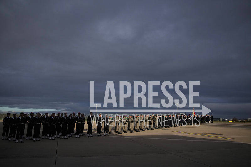 Soldiers line up as they wait for the arrival of Ukrainian President Volodymyr Zelenskyy Monday, Nov. 17, 2025 at the Villacoublay air base near Paris. (AP Photo/Christophe Ena, Pool)