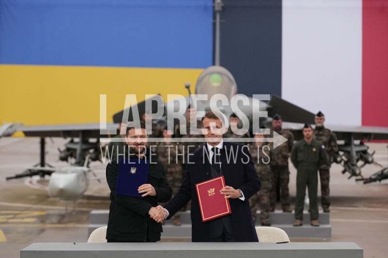 French President Emmanuel Macron, right, and Ukrainian President Volodymyr Zelenskyy shake hands after signing an agreement Monday, Nov. 17, 2025 at the Villacoublay air base near Paris. (AP Photo/Christophe Ena, Pool)