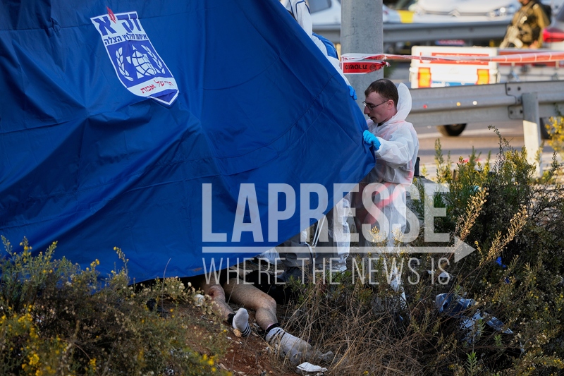 The body of a man who, according to Israeli security officials at the scene, was one of the attackers lies on the ground as first responders place a fabric cover over the area at the site of a ramming and stabbing attack near the West Bank settlement of Gush Etzion, Tuesday, Nov. 18, 2025. (AP Photo/Ohad Zwigenberg)