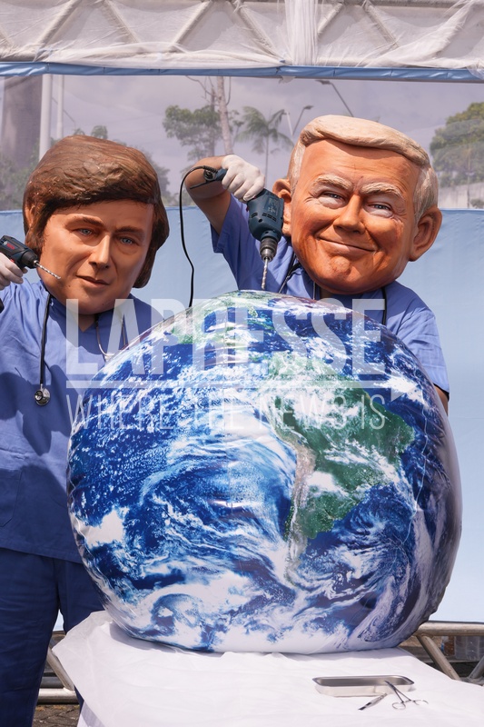Demonstrators with the likeness of Argentina President Javier Milei, left, and President Donal Trump pretend to pretend to drill into the Earth during the COP30 U.N. Climate Summit, Thursday, Nov. 20, 2025, in Belem, Brazil. (AP Photo/Andre Penner)