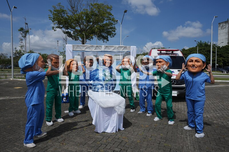 Demonstrators with the likeness of world leaders including President Donal Trump, center, pretend to drill into the Earth during the COP30 U.N. Climate Summit, Thursday, Nov. 20, 2025, in Belem, Brazil. (AP Photo/Andre Penner)