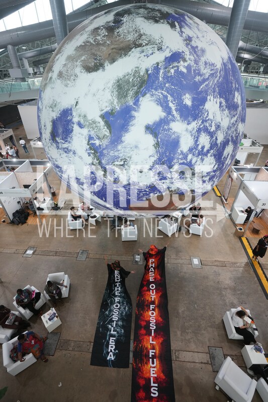 Activists participate in a demonstration to end the use of fossil fuels at the COP30 U.N. Climate Summit, Thursday, Nov. 20, 2025, in Belem, Brazil. (AP Photo/Andre Penner)