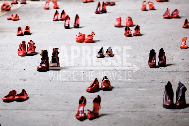 Installation \"Zapatos rojos\" curated by the Enrico Fermi Salò high school in Brescia and inaugurated at the Chiostro della Cisterna of Palazzo San Macuto on the occasion of the International Day for the Elimination of Violence against Women, Rome, Tuesday, November 25, 2025 (Photo by Roberto Monaldo / LaPresse)