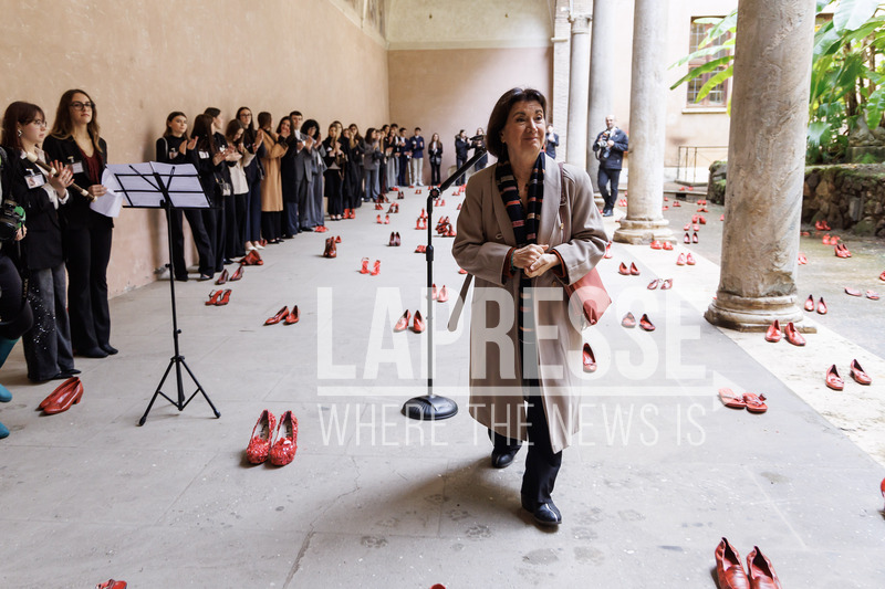 Family minister Eugenia Roccella at the Chiostro della Cisterna of Palazzo San Macuto during the inauguration of the "Zapatos Rojos" installation on the occasion of the International Day for the Elimination of Violence against Women, Rome, Tuesday, November 25, 2025 (Photo by Roberto Monaldo / LaPresse)