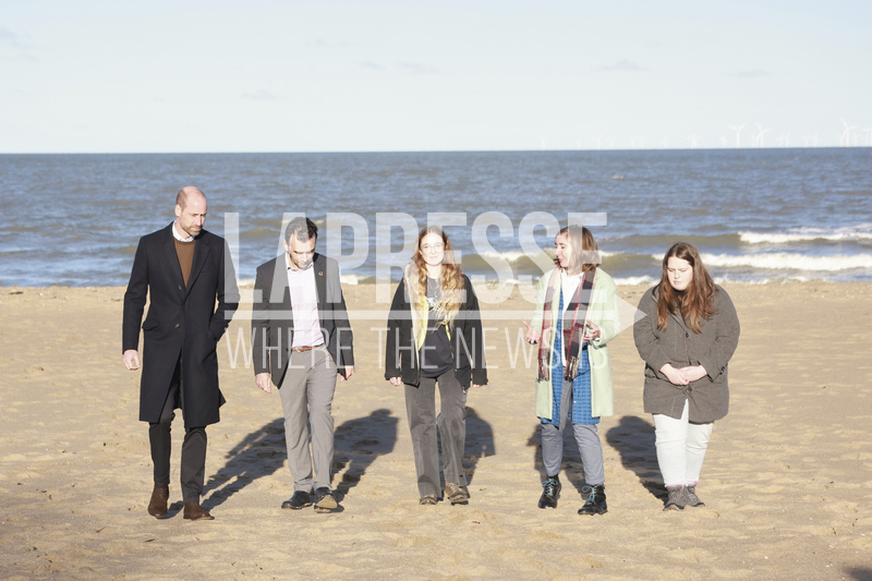 Britain's Prince William, left, during a beach walk with young people who are part of the Marine Conservation Society's Youth Ocean Network, in Colwyn Bay, Wales, Tuesday, Nov. 2025. (Ian Vogler/Pool Photo via AP)