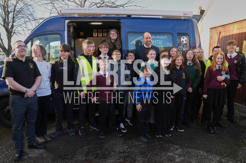 Britain\'s Prince William poses for a group picture as he visits Youth Shedz in Mochdre, Colwyn Bay, Wales, Tuesday, Nov. 25, 2025. (AP Photo/Jon Super, Pool)