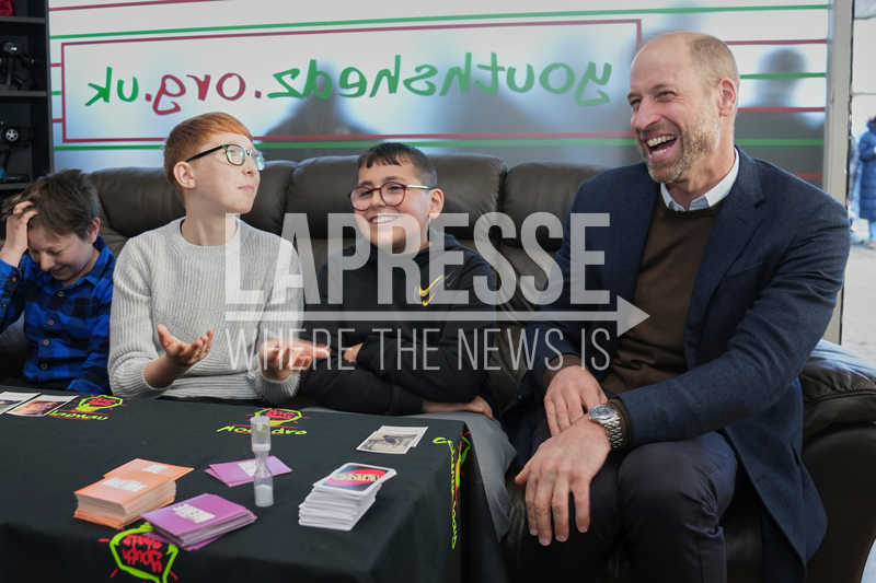 Britain\'s Prince William reacts as he plays a game with young people as he visits Youth Shedz in Mochdre, Colwyn Bay, Wales, Tuesday, Nov. 25, 2025. (AP Photo/Jon Super, Pool)