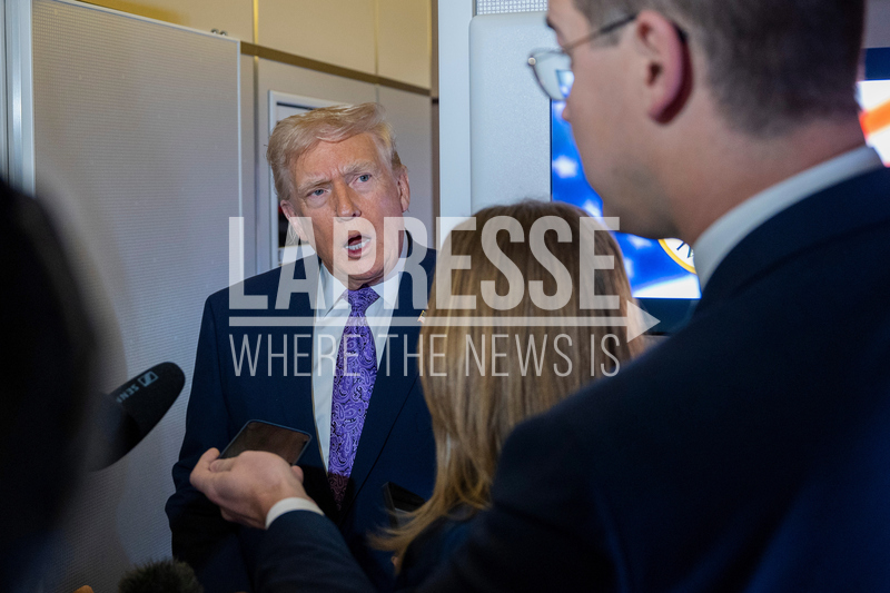 Il Presidente Trump parla con i giornalisti a bordo dell\'Air Force One