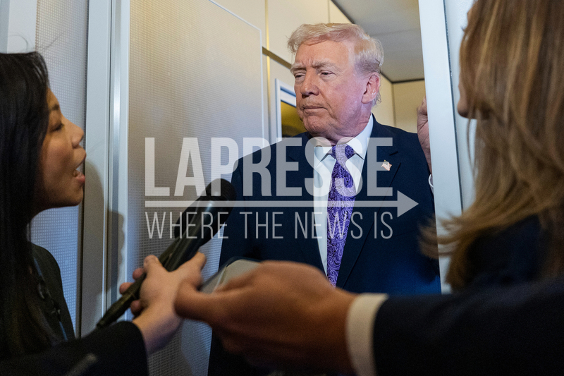 Il Presidente Trump parla con i giornalisti a bordo dell\'Air Force One