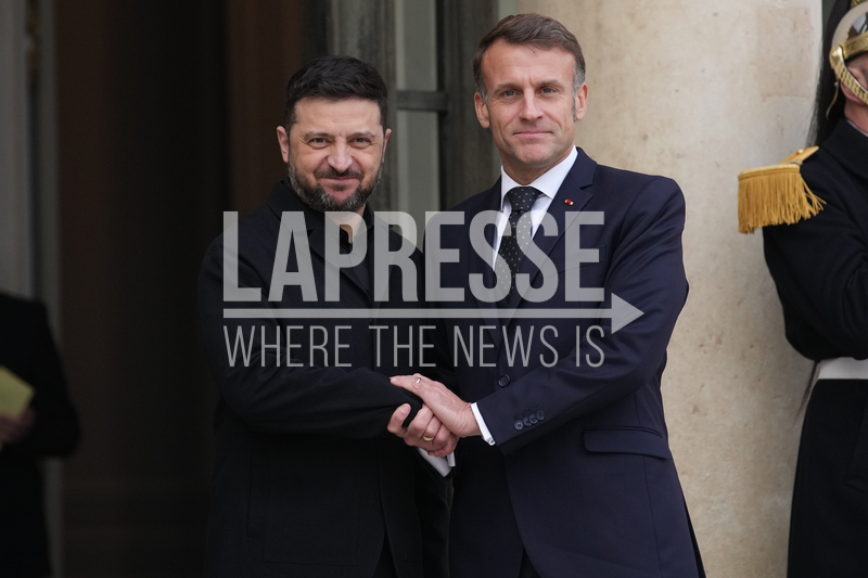 French President Emmanuel Macron, right, welcomes Ukrainian President Volodymyr Zelenskyy, Monday, Dec. 1, 2025 before a meeting at the Elysee Palace in Paris. (AP Photo/Christophe Ena)