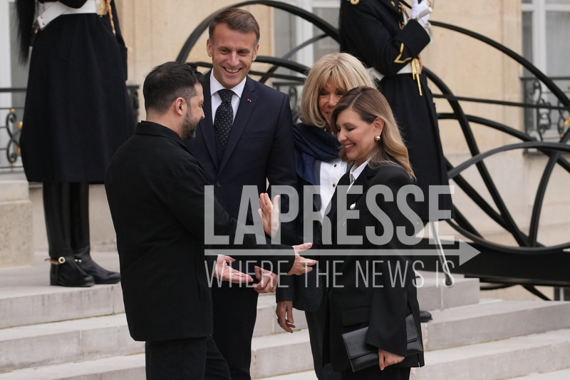 French President Emmanuel Macron, center background, and his wife Brigitte Macron, right background, welcome his Ukrainian counterpart Volodymyr Zelenskyy and his wife Olena Zelenska at the Elysee Palace, in Paris, Monday, Dec. 1, 2025. (AP Photo/Christophe Ena) Associate Press/ LaPresse Only Italy and Spain