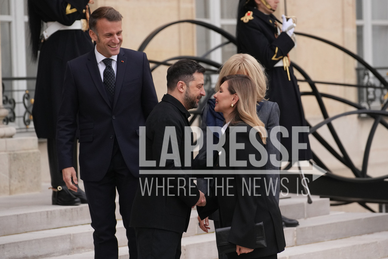 French President Emmanuel Macron, center background, and his wife Brigitte Macron, right background, welcome his Ukrainian counterpart Volodymyr Zelenskyy and his wife Olena Zelenska at the Elysee Palace, in Paris, Monday, Dec. 1, 2025. (AP Photo/Christophe Ena)