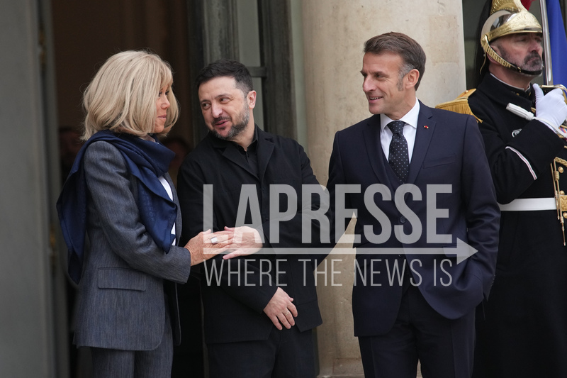 French President Emmanuel Macron, right, his wife Brigitte Macron, left, and Ukrainian President Volodymyr Zelenskyy, center, wait for the arrival of Zelenskyy's wife Olena Zelenska at the Elysee Palace, in Paris, Monday, Dec. 1, 2025. (AP Photo/Christophe Ena)