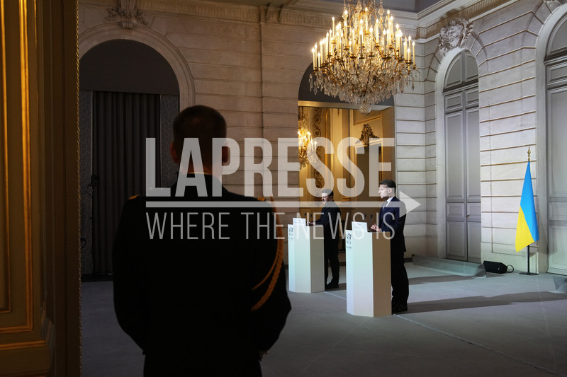 French President Emmanuel Macron, center right, and Ukrainian President Volodymyr Zelenskyy give a joint press conference at the Elysee Palace in Paris, Monday, Dec 1, 2025. (AP Photo/Christophe Ena, Pool) Associate Press/ LaPresse Only Italy and Spain