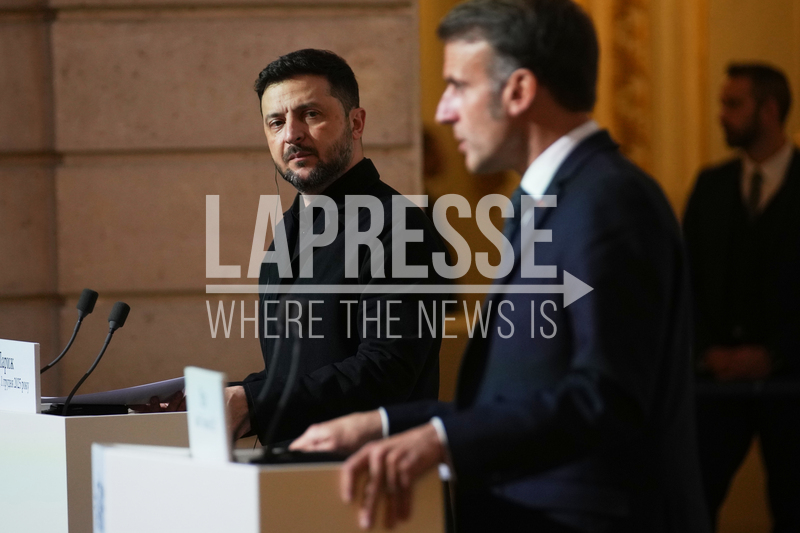 French President Emmanuel Macron, right, and Ukrainian President Volodymyr Zelenskyy give a joint press conference at the Elysee Palace in Paris, Monday, Dec 1, 2025. (AP Photo/Christophe Ena, Pool)