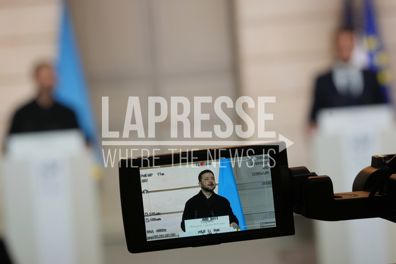 Ukrainian President Volodymyr Zelenskyy is seen on a camera screen as he gives a joint press conference with France's President Emmanuel Macron, unseen, at the Elysee Palace in Paris, Monday, Dec 1, 2025. (AP Photo/Christophe Ena, Pool)