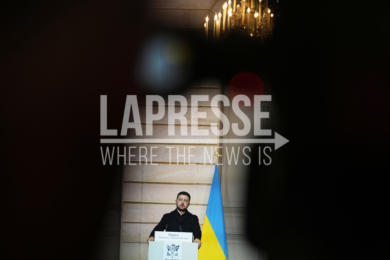 Ukrainian President Volodymyr Zelenskyy gives a joint press conference with France's President Emmanuel Macron, unseen, at the Elysee Palace in Paris, Monday, Dec 1, 2025. (AP Photo/Christophe Ena, Pool)
