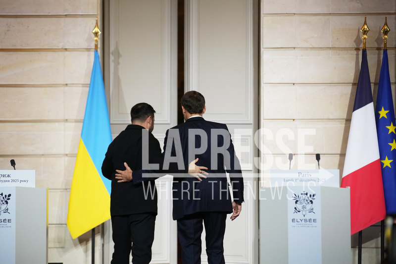 French President Emmanuel Macron, right, and Ukrainian President Volodymyr Zelenskyy leave after a joint press conference at the Elysee Palace in Paris, Monday, Dec 1, 2025. (AP Photo/Christophe Ena, Pool)