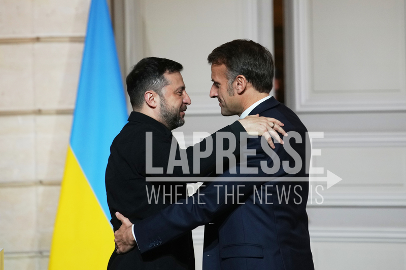 French President Emmanuel Macron, right, and Ukrainian President Volodymyr Zelenskyy hug each other after a joint press conference at the Elysee Palace in Paris, Monday, Dec 1, 2025. (AP Photo/Christophe Ena, Pool) Associate Press/ LaPresse Only Italy and Spain