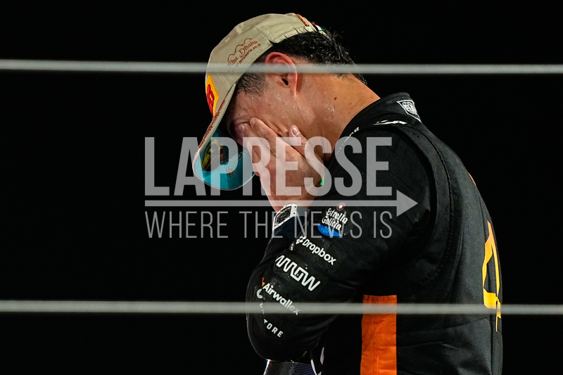 McLaren driver Lando Norris of Britain reacts after becoming a world champion after the Formula One Abu Dhabi Grand Prix at the Yas Marina Circuit in Abu Dhabi, UAE, Sunday, Dec. 7, 2025. (AP Photo/Fatima Shbair)