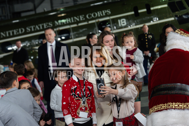 First lady Melania Trump takes a selfie with kids during a Toys for Tots charity drive event at Marine Corps Base Quantico, Monday, Dec. 8, 2025, in Quantico, Va. (AP Photo/Julia Demaree Nikhinson)
