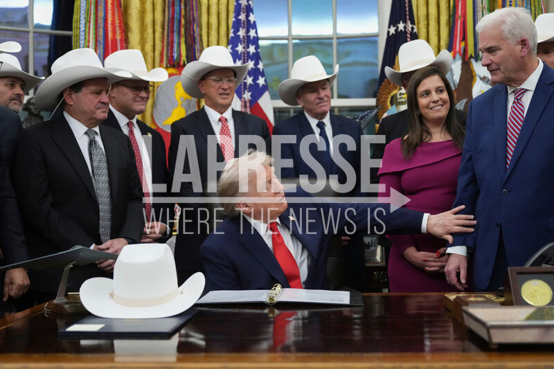 President Donald Trump attends a bill signing ceremony with members of the 1980 U.S. Men's Olympic Hockey team, Rep. Elise Stefanik, second right, and Rep. Tom Emmer, right, Friday, Dec. 12, 2025, in the Oval Office of the White House in Washington. (AP Photo/Jacquelyn Martin) Associate Press/ LaPresse Only Italy and Spain