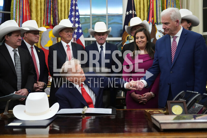 President Donald Trump attends a bill signing ceremony with members of the 1980 U.S. Men's Olympic Hockey team, Rep. Elise Stefanik, second right, and Rep. Tom Emmer, right, Friday, Dec. 12, 2025, in the Oval Office of the White House in Washington. (AP Photo/Jacquelyn Martin)