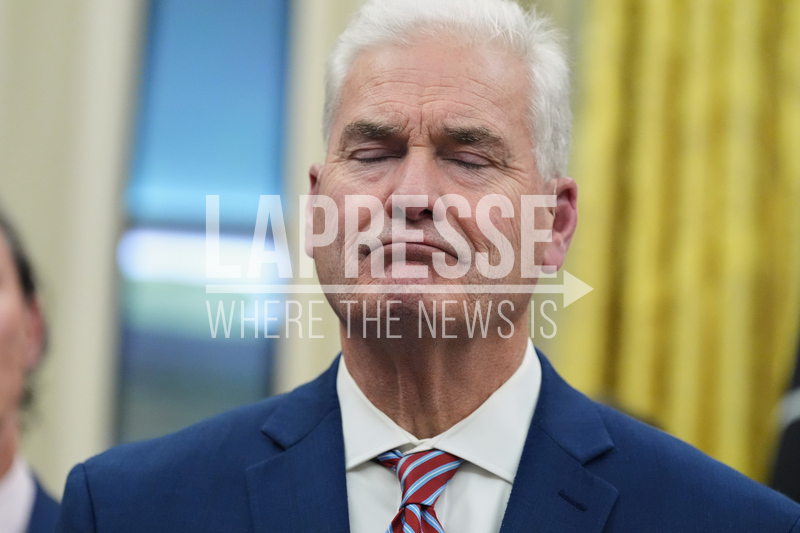Rep. Tom Emmer, R-Minn., listens to President Donald Trump speak during a bill signing ceremony Friday, Dec. 12, 2025, in the Oval Office of the White House in Washington. (AP Photo/Jacquelyn Martin)
