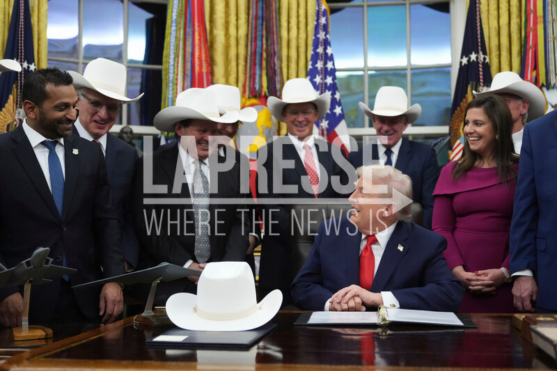 President Donald Trump looks back at Mike Eruzoine during a bill signing ceremony with members of the 1980 U.S. Men's Olympic Hockey team, Friday, Dec. 12, 2025, in the Oval Office of the White House in Washington. Rep. Elise Stefanik, R-N.Y., is on President Trump's right. (AP Photo/Jacquelyn Martin)(AP Photo/Jacquelyn Martin)