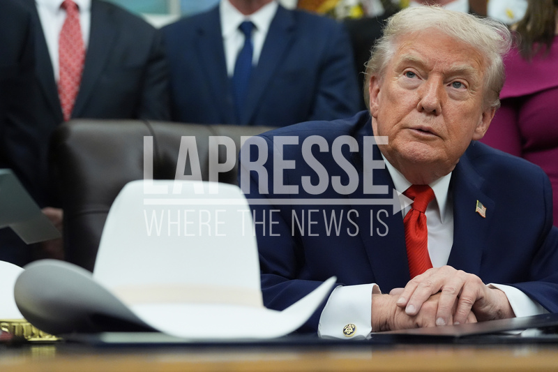 President Donald Trump listens to media questions after a bill signing ceremony with members of the 1980 U.S. Men's Olympic Hockey team, Friday, Dec. 12, 2025, in the Oval Office of the White House in Washington. (AP Photo/Jacquelyn Martin)